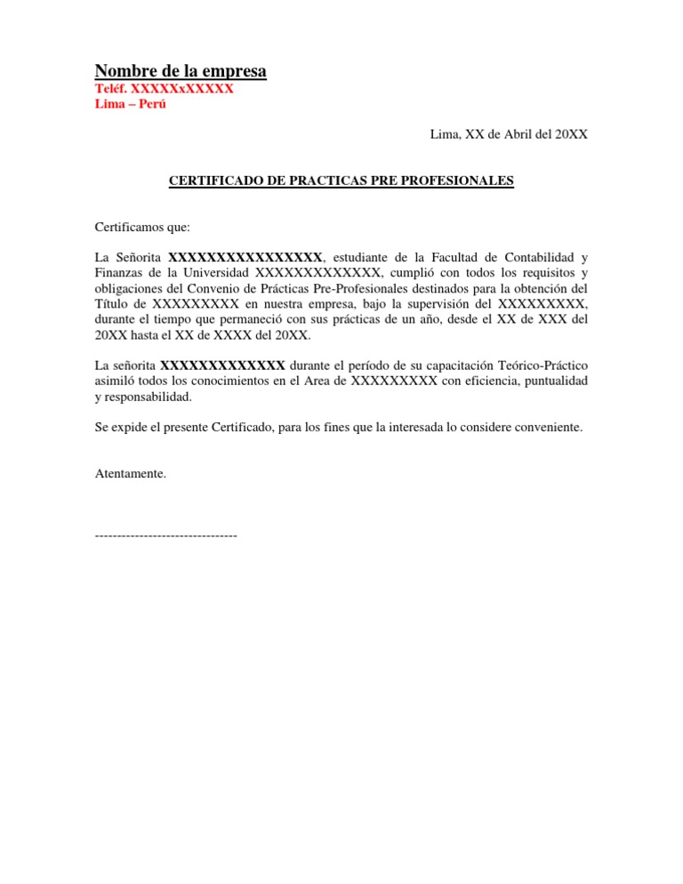 Una carta de presentacin para hacer prcticas debe estar muy bien escrita esta ser la primera impresin que tenga el jefe de recursos humanos a cerca de ti as que debes estar atento a. Que siendo requisito indispensable obtener la carta de presentacin para poder hacer las prcticas pre profesionales. Certificado de Practicas Profesionales Modelo.